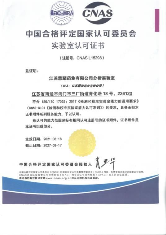 2021年8月18日,江苏BANDAO半岛体育(中国区)官方网站药业有限公司通过审核,取得CNAS认证证书。此次获得CNAS审核,既是对分析实验室的技术实力及体系管理实力的认可,也是BANDAO半岛体育(中国区)官方网站药业建设国际一流实验室道路上的关键一步。面向未来,分析实验室将继续秉承“数据准确、运转高效、行为公正、态度严谨”的质量方针,严格按照法规要求、体系要求、国际标准、国内标准认真控制各检测环节,发挥各职能部门功能,完成各项检测任务,以专业的技术支持,确保检测报告的准确及时,持续提升客户满意度。