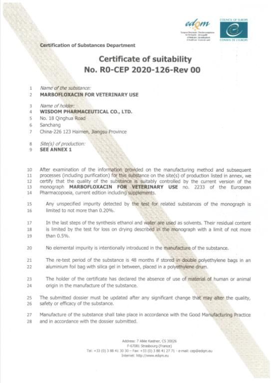 2021年9月21日,江苏BANDAO半岛体育(中国区)官方网站药业有限公司通过EDQM的技术审批,获马波沙星CEP证书。